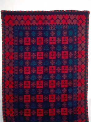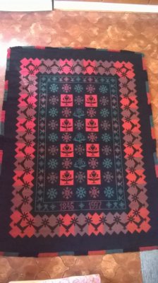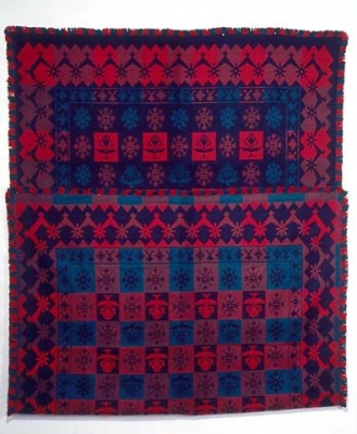 Suomen kansallismuseon kokoelmissa on samalla mallilla kudottu täkänä kuin teidän täkänänne on. Museon täkänä on saatu kokoelmiin Ilmajoelta vuonna 1996. Täkänän museolle myyneen henkilön äiti oli saanut sen häälahjaksi vuonna 1929. Museon täkänä on isokokoinen (2,80 m x 1,48 m). Kokoelmissa on myös kaksi muuta samalla mallilla tehtyä pienempää täkänää (n.70 x 140 cm), joista puuttuu reunoja kiertävä kuvio. Teidän täkänässä oleva myöhäisempi vuosiluku viittaa siihen, että se on valmistettu vuonna 1997. Aikaisempi vuosiluku voisi puolestaan kertoa sen, että se on kopioitu vanhasta täkänästä, jossa on ollut vuosiluku 1845. Toki se voi merkitä jotain muutakin.