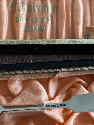 Lusikka on siis hopeaa ja sen on valmistanut kultaseppä Tuomas Polvinen Mikkelissä vuonna 1926. Kuvassa taustalla näkyvä laatikko kuuluu tekstistä päätellen yhteen lusikan kanssa.