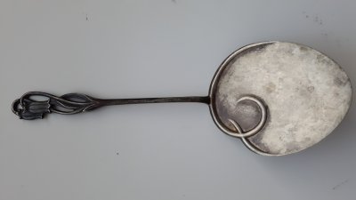 Toisin kuin hopeaan, alpakkaan ei ole tarvinnut lyödä vuosileimaa. Siksi emme leiman perusteella saa selville kakkulapion tarkkaa valmistusvuotta. Aikaväliltä 1925-89 se siis kuitenkin on, ja tyylin perusteella arvelisin että tuon ajanjakson alkupuolelta. En löytänyt meiltä Kansallismuseon kokoelmista vastaavaa kukkakuviota. Ruusukuviota on varsinkin lusikoissa käytetty runsaasti, mutta muut kukka-aiheet ovat harvinaisempia. Kultakeskus valmistaa edelleen nk. kuukausilusikoita, joissa on eri kukka-aiheet eri kuukausien lusikoiden varressa. Tässäkin sarjassa on kellokukka-aihe, mutta se ei ole samanlainen kuin teidän kakkulapiossanne.