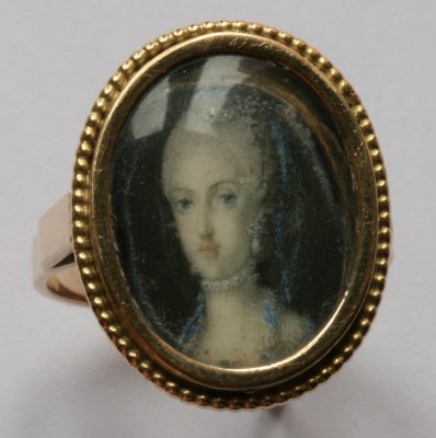Sormuksen sisällä oleva miniatyyrimaalaus vaikuttaa kuvan perusteella olevan 1700-luvun loppupuolelta. Miniatyyrimuotokuvat on useimmiten kehystetty medaljongin sisään, mutta niitä käytettiin 1700-luvulla ja 1800-luvun alussa myös koristeena sormuksissa, rannekoruissa ja rintakoruissa. Miniatyyrimuotokuvat oli tuohon aikaan maalattu guassi- ja akvarelliväreillä ohuelle norsunluulevylle. Maalausten päälle laitettiin lähes poikkeuksetta lasi joka suojasi maalausta. Värit lähtevät nimittäin herkästi irti jos maalauspintaa pyyhkäisee kostealla. Lisäksi ohut norsunluulevy halkeaa helposti jos sitä taivutetaan tai se kuivuu liikaa.