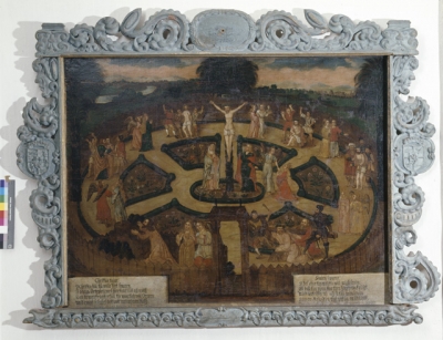 Kyseinen teos kuuluu nykyään Kansallismuseon kokoelmiin. Maalaus on tullut Kansallismuseoon lahjoituksena jo vuonna 1907. Maalaus on tällä hetkillä esillä Kansallismuseon perusnäyttelyssä Luterilaisessa kirkkosalissa, joten sitä pääsee helposti katsomaan. Maalaukseen on tosiaan kuvattu pyöreä puutarha tai yrttitarha, jonka keskellä on ristiinnaulittu Kristus ja ympärillä on kuvattuna kohtauksia Kristuksen kärsimyshistoriasta. Puutarhaan on maalattu erilaisia kukkia, mutta ne ovat niin tyyliteltyjä että on vaikea määritellä mitkä nimenomaiset kukkalajit ovat kyseessä. Itse tulkitsin yhden kukan ruusuksi ja toinen on mahdollisesti lilja, nämähän ovat perinteisesti kristilliseen kuvastoon kuuluvia kukkia.
