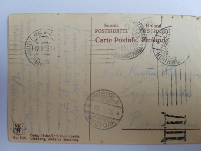 Kortti on muista leimoista päätellen lähetetty vuonna 1916 Karjalankannakselta, Pyhäjärven Konnitsan kylästä Lappeenrantaan. Se on kulkenut myös mm. Viipurin postikonttorin kautta, missä olettaisin sensuuritarkastuksenkin tapahtuneen.