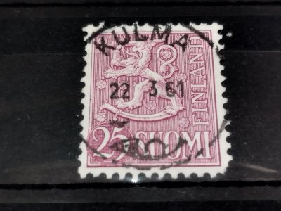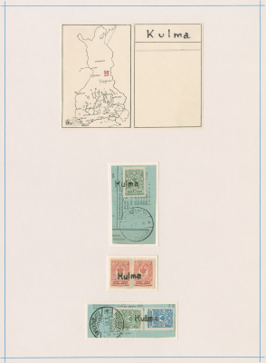 Toimipaikkatietokantamme tuntee kaksi Kulma-nimistä toimipaikkaa. Toinen on Kulma-nimellä 1.5.1907 perustettu postipysäkki. Pysäkki perustettiin Kulman majatalolle Pensiön kylään Suomussalmen pitäjään. 1.4.1925 tämän toimipaikan nimi muuttui Laajaksi (Laaja), ja 1.3.1937 Laaja muuttui postiasema 2:ksi, 1.1.1938 postiasema 1:ksi. Laaja lakkautettiin 1.6.1981. Kuvassa Kulma-kyläleimoja. Päiväykset Hyrynsalmella leimatuissa venäläisleimoissa 8.11.1916 ja 5.7.1916, ja keskellä oleva 10 pennin venäläismallinen postimerkki on ilmestynyt vuonna 1911. Kuvassasi oleva Kulma-pyöröleima onkin siis todennäköisesti tästä allaolevasta toisesta Kulmasta, koska 1960-luvulla Suomussalmen Kulma on ollut jo Laaja.