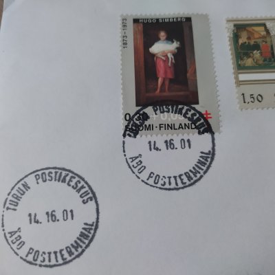 Kokonaan näkyvissä oleva postimerkki Hugo Simbergin syntymästä 100 vuotta on julkaistu 12.9.1973, ja on ollut käypä 31.12.2011 saakka. Kuvan ulkopuolelle rajautunut postimerkki on Turun akatemian vihkiäiskulkue vuodelta 1982, ja se on ollut samoin käypä vuoden 2011 loppuun saakka.