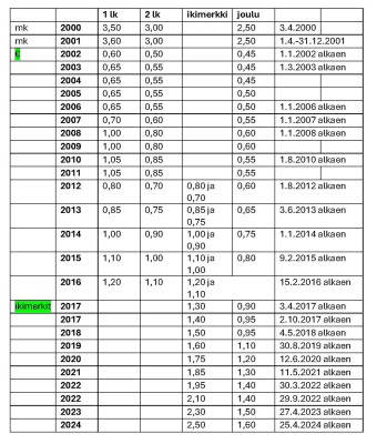 Ohessa taulukko, mikä kertoo kotimaan kirjemaksujen (50 g kirje tai kortti) kehityksen vuodesta 2000 tähän päivään saakka. Muutama ensimmäinen rivi on siis vielä markka-aikaa, ja vuodesta 2017 alkaen käytössä ovat olleet pelkästään ikimerkit.