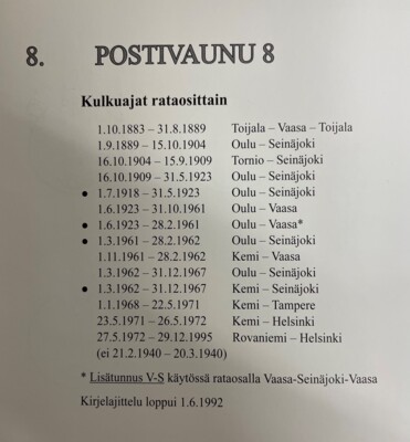 Kortissa on venäläinen postivaunuleima. K.P.X.P. N:o 8 viittaa postivaunun numeroon. Postivaunu nro 8 kulki rataosuudella Oulu - Seinäjoki vuonna 1913. Ohessa kuva postivaunu 8:n rataosuuksista teoksesta Postia junalla - Postileimat Suomen rautateillä 1870 - 1995, Antti lehmus ja Olavi Helminen, Helsinki 2009. Itsenäistymisen jälkeen postivaunuleimasimistakin poistettiin venäjänkielinen nimi tai vaihdettiin leimasin uuteen suomenkieliseen.