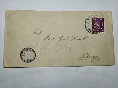 Kirjeen osoitepuolella on mallin 1930 violetti 2 markan postimerkki, joka ilmestyi 1.2.1932. Leima näkyy kuvassa hieman huonosti, mutta näyttäisi Kronoby - Kruununkylä -leimalta. Toimipaikka perustettiin Kronoby-nimellä, ja suomenkielinen nimi siihen lisättiin 21.1.1933: Kronoby - Kruununkylä. Kruununkylä-nimi muutettiin Kruunupyyksi 1.1.1937. Lisätietoja Postimuseon postitoimipaikkaselaimesta: https://www.postitoimipaikat.fi#/toimipaikat/697354a6ae74f1668750179b . Postileiman päivämääräkään ei näy kokonaan, mutta kirjeen taustalla oleva Albegra - Leppävaara -tuloleima kertoo sen saapuneen perille vastaanottavaan postitoimistoon 25.4.1934. Tuloleimoja käytettiin 1960-luvulle saakka, aluksi ne olivat ANK (ankommen) -leimoja, ja vähitellen tuloleimana alettiin käyttää vastaanottavan postikonttorin normaalia päivämääräleimaa.