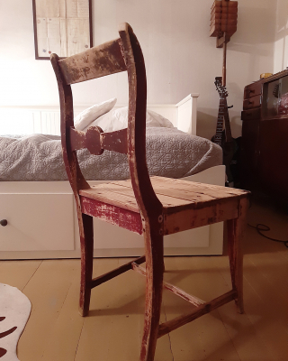 Tuolissasi voi mielestäni nähdä aavistuksen verran piirteitä biedermeier-tyylistä. Siro, joskus koristeltu, poikkilauta oli yksi biedermeier-tuoleille tyypillisistä piirteistä. Samoin s-muotoiset linjat. Biedermeierin suosikkipuulaji oli mahonki ja tuoliisi valittu punainen väri voi olla viittaus siihen. Biedermeier-tyyli oli muodissa noin 1820-1850, mutta tuolisi ikää on silti lähes mahdoton arvioida valokuvien perusteella. Se voi olla tehty 1800-luvun puolella, mutta yhtä hyvin se on voitu valmistaa tekijänsä mieltymysten mukaan 1900-luvun alkuvuosikymmenien aikana.