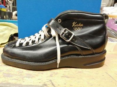 Karhu on valmistanut tuon tyyppisiä mäkihyppykenkiä jo 1950-luvulla. Tuotekuvaston mukaan kengät olivat tuolloin ruskeita. 1960-luvun esitteessä Karhu-Mäki -kenkä on väriltään musta, joten arvelisin, että kuvan kenkä on valmistettu 1960-luvulla. Täysin tarkkaa vuotta en pysty sanomaan.