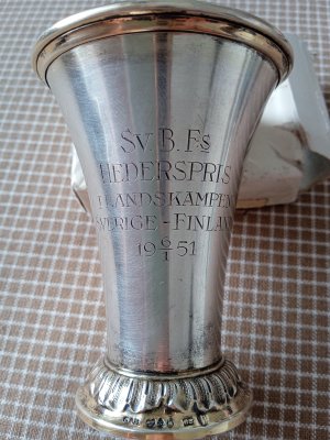 Pokaali on kunniapalkinto Ruotsin ja Suomen keilailumaaottelusta 6.1.1951. SV. B. F:s lyhenne viittaa siihen, että se on Ruotsin keilailuliiton (Svenska Bowlingförbunds) myöntämä. Tuona päivänä Suomen ja Ruotsin keilailumaajoukkueet kohtasivat toisensa samaan aikaan Helsingissä ja Tukholmassa, kummassakin kaupungissa 8-henkisin joukkuein. Helsingissä voitti Suomi, Tukholmassa Ruotsi. Lisätietoa tapahtumasta löytyy mm. Helsingin Sanomien jutusta 8.1.1951, jonka voi käydä lukemassa esim. HS:n Aikakone-palvelun avulla.