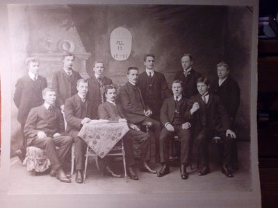 Kaikki kuvan miehet näyttävät niin samanikäisiltä, että arvelisin kuvaa jopa luokkakuvaksi. Kyseessä voisivat olla joko tietyn oppiaineen yhden vuosikurssin opiskelijat tai vaikka lukiotoverusten kokoontuminen joitakin vuosia ylioppilaaksi pääsyn jälkeen. Sopisiko tämä isoisäsi historiaan?
