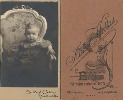 Kysyisin onko Turussa ollut toinenkin Atelier Hellas ja kuka on valokuvaaja Gustaf Clelin, joka on käyttänyt Atelier Hellaksen korttipohjia vuonna 1927. Hänestä ei löytynyt tietoja Kuka kuvasi -sivuilta. Kyseisessä kuvassa on äitini, joka on syntynyt syyskuussa 1926 ja on kuvassa puolivuotias, joten se on täytynyt ottaa vuonna 1927. Kuva on skannattu molemmin puolin.