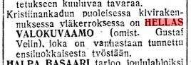Kiitos kysymyksestäsi, jonka ansiosta saimme mekin lisätietoja Atelier Hellaksesta. Kuvaamon omistajan nimi on Gustaf Welin, eli Clelin. Tiedossamme ei ollut, että turkulainen valokuvaaja Gustaf Welin omisti Atelier Hellaksen, mutta haku sanalla "Hellas" 1920- ja 1930-luvun Turun Sanomien digitoituihin numeroihin paljasti, että näin on. 22.12.1925 Gustaf Velin (yksöis-v:llä, joka teidänkin visiittikorttipohjassanne on) ilmoittaa kuvaamon toiminnasta, ja jouluaaton numeroissa 1929 ja 1930 hän toivottaa useiden muiden turkulaisten liikkeenharjoittajien kanssa asiakkailleen hyvää joulua. Lehti-ilmoittelu jatkuu vuoteen 1933.