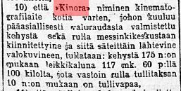 Kävin läpi Kansalliskirjaston digilehtiarkistoa, ja marraskuulta 1912 ensimmäiset hakutulokset sieltäkin löytyvät. Useampikin sanomalehti kirjoittaa 8.11.1912 tullikäsittelyasioiden palstallaan Kinorasta, jonka tullitaksat on ilmeisesti tuolloin määritelty. Tästä voisi päätellä, että aiemmin niitä ei ole maahan tuotu.