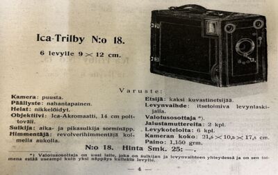 Täällä arkistoja tutkiessa tärppäsi heti: perintökameranne löytyi Anton Podworskyn valokuvaustarvikeliikkeen vuoden 1912 hinnastosta. Se on saksalaisen ICA-kameravalmistajan Trilby-sarjaa, jota oli Podworskylla tuolloin myynnissä kymmentä hieman erilaista mallia. Niistä edullisin ja yksinkertaisin oli hinnaltaan 8 markkaa ja kallein 75 markkaa. Tämä Ica-Trilby N:o 18 oli myynnissä 25 markan hintaan.