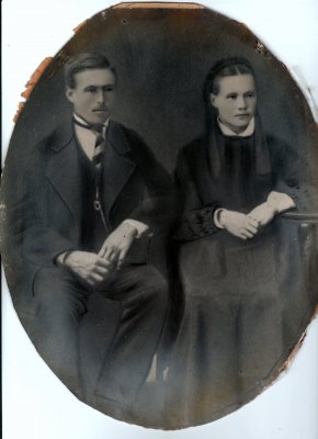 Minulla on isäni jäämistöstä vanha valokuva, josta ei tietoja henkilöistä eikä kuvan iästä. Isäni on syntynyt 1910. Ilmajoella, Pohjanmaalla. Ensimmäinen arvaus voisi olla, että kyse hänen vanhemmistaan, mutta isän isä eli 1885-1912, ja tästä parista on kuva (vertailukuva). Onko kyseessä samat henkilöt? Tuntemattomassa kuvassa ei ole kuvaajan nimeä, ei aikaa, ei henkilöiden nimiä. Naulat ruostuneet, pahvi ruskeaa, taustapaperi haperoa, lasi leikattu kömpelösti, hyvin epätasainen. Olen miettinyt, olisiko edellisestä sukupolvesta? Kyse nuoresta parista, mutta ehkä ei kuitenkaan hääkuva? Naisella musta kangaspäähine, mihin se viittaa? Körttiläisyyttä oli alueella. Säilytän kuvan, jos saan vahvistusta henkilöiden suhteen. Edellisen sukupolven aikuisista ei ole nuoruuskuvia, vanhempaa materiaalia on.