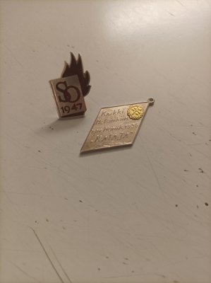 Toinen merkki on hankalampi. Kataja voisi olla esimerkiksi Mäntyharjulla toiminut Osuusliike Kataja tai Joensuun Kataja taas oli urheiluseura. Mitään merkittävää tapahtumaa, joka näihin liittyisi, en keksi tuolta heinäkuun päivältä eivätkä niiden symbolitkaan vastaa tätä merkkiä. Toivotaan, että joku sivulla kävijöistä osaisi auttaa!