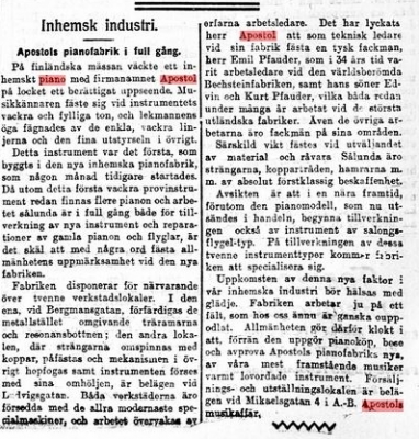 piano on kapellimestari Aleksei Apostolin (1866-1927) vuonna 1920 perustaman pianotehtaan tuotantoa. Ks. lehtileike ja. lisätiedot Apostolista: http://itsenaisyys100.fi/persons/apostol-a/