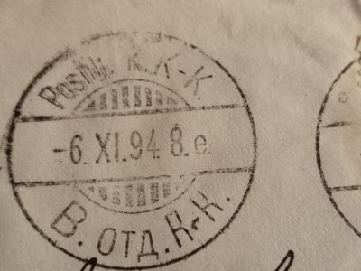 Leiman päiväys on 6.11.1894 ja 8e päiväyksen jälkeen viittaa leimauskellonaikaan: "8 eftermiddag" eli klo 20. Postilj.k. K - K -tekstissä K - K viittaa tietyllä rataosuudella kulkeneeseen postiljoonivaunuun. Antti Lehmuksen ja Olavi Helmisen vuonna 2009 kirjoittaman Postia junalla -kirjan mukaan vaunu K - K on 1.1.1894 - 30.6.1966 kulkenut Kouvola - Kotka -rataosalla, joka on valmistunut vuonna 1890. Lähetyksesi on osoitettu Riihimäelle, joten mahdollisesti se on jatkanut vielä seuraavankin rataosan postivaunussa, vaikka siitä ei leimausta olekaan.