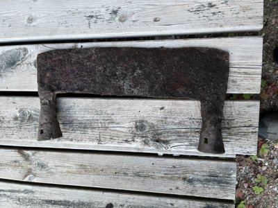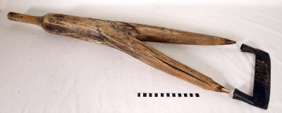 Hei, mikähän kuvassa lappeellaan oleva esine? Mihin tarkoitukseen sitä on käytetty? (Jonkin sortin ”kahden käden hakkuri” ehkä?)