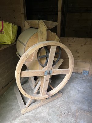 Tämä on todellakin viljan peittauslaite. Säiliöön laitettiin sopiva määrä (ei täyteen) viljaa sekä sopiva annos jauhemaista peittausainetta. Sitten nämä sekoitettiin pyörittämällä säiliötä. Sekoituksen jälkeen säiliö tyhjennettiin alla olevan suppilon avulla säkkiin.