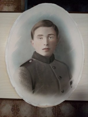 Alkuperäisen kuvan iästä on vaikea sanoa paljoakaan, kun mahdolliset yksityiskohdat ovat suurennuksen ja värityksen myötä häipyneet. Sijoittaisin sen 1910- ja 1930-lukujen välille. Kyseessä näyttää olevan univormu, mutta sen tarkempi arviointi saattaisi onnistua paremmin esimerkiksi Sotamuseon asiantuntijoilta.