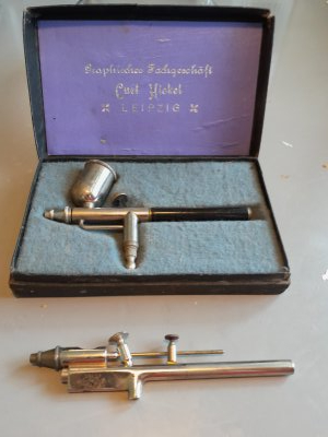Hei! Minulla on väripistooli, joka on ollut entisajan kuvankäsittelyssä valokuvaajan käytössä. Haluaisin tietää, miten sitä on siinä työssä tarkasti ottaen käytetty? Säilytyslaatikossa lukee: Graphisches Fachgeschaft Curt Hiekel Leipzig. Laite ei ole juuri nyt minulla, mutta on lähes kuvan mukainen (kuvan säilytyslaatikon teksti on samanlainen, mutta minulla olevan laitteen varsiosa on bakeliittia).