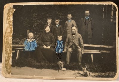 Aloitetaan kabinettikorttipohjukkeelle pohjustetusta perhekuvasta, johon on ihastuttavasti saatu mukaan myös nelijalkaisia perheenjäseniä. Sijoittaisin sen vuosisadan vaihteen tienoille sekä valokuvateknisten seikkojen että henkilöiden tyylin perusteella. 1860-luvulla henkilöitä ja ryhmiä kuvattiin lähes yksinomaan studiotiloissa, kun taas kuvan kaltainen vapaamuotoisempi poseeraus ulkona kuuluu kyläkuvaajien tai kiertävien kuvaajien aikakauteen, joka osuu juuri vuosisadan vaihteeseen. Tässä vaiheessa valokuvaukseen sekä kuvien kehitykseen ja vedostukseen tarvittavat välineet oli jo helpompi kuljettaa mukana ja ottaa käyttöön ulkosallakin. Vuosisadan vaihteessa kyläkuvaajia ja kiertäviä kuvaajia oli kaikkialla Suomessa, joten perhe on voitu hyvin ikuistaa kotipihallaan, Kuopion seudulla tai missä tahansa muuallakin.