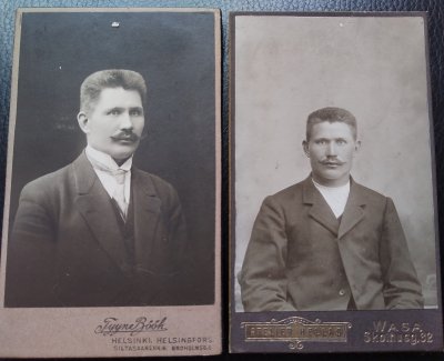Mietin, ovatko nämä herrat sama henkilö. Siksi kiinnostaa, milloin nuo kuvaamot ovat toimineet. Kuvat ovat sukualbumista, vaan en tiedä kenenkään olleen Vaasasta. Vai onko muuttanut sinne. Eli kumpi kuva mahdollisesti on vanhempi? Kummankaan kuvan takana ei ole mitään tekstiä.