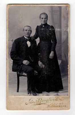 Ovatko oheisen kuvan henkilöt nimettävissä eli olisiko Ida Berglundin kuvaamon asiakaskortistoa Raumalta säilynyt. Poristahan sellaista ei aiemman vastauksenne mukaan ole tallella. Kuva lienee 1900-luvun alkupuolelta, mitä todennäköisimmin Ida Berglundin Rauman kuvaamossa otettu, mahdollisesti vihkikuva. Selkäpuolelle on kirjoitettu Nro 20, joka on vedetty yli. Sen tilalle on kirjoitettu numero 38462. Lisäksi selkäpuolella on leimasimella tehty numero 63602. Käsin kirjoitetussa tekstissä saattavat olla nimet Anna ja Ahjo.