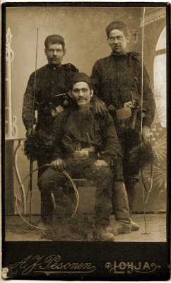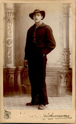 Jotain kuitenkin voidaan päätellä kuvista itsestään. Kolmen miehen ryhmäkuvassa poseeraavat nuohoojat työvaatteissaan ja työvälineineen - ehkä jopa hieman nokisina. Kahden ystävyksen kuvan takimmaisessa miehessä ja yksin poseeraavassa hattupäisessä nuorukaisessa olen näkevinäni yhdennäköisyyttä; kenties kyseessä voisivat olla saman perheen jäsenet ellei jopa sama henkilö. Vaatteet tosin kertovat hyvin erilaisista elämäntilanteista. Rennon hattupään hieman kulunutta asua merimiesmallisine kauluksineen en suoralta kädeltä tunnista, mutta se liittynee hänen ammattiinsa.